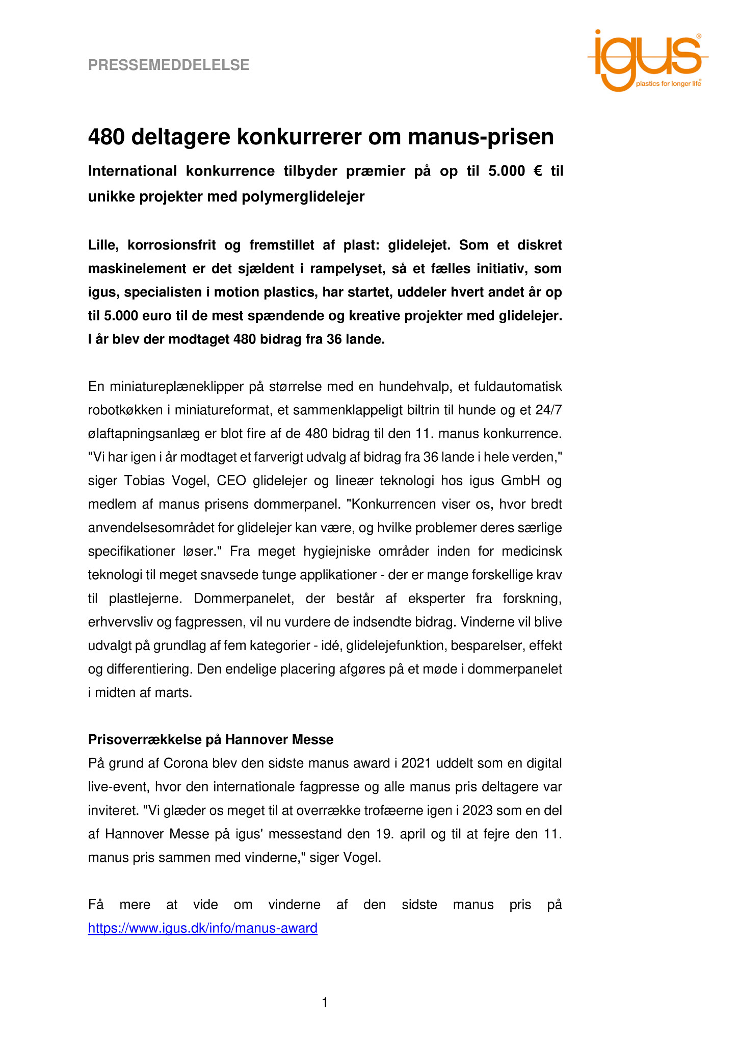 På grund af Corona blev den sidste manus award i 2021 uddelt som en digital live-event, hvor den internationale fagpresse og alle manus pris deltagere var inviteret. “Vi glæder os meget til at overrække trofæerne igen i 2023 som en del af Hannover Messe på igus’ messestand den 19. april og til at fejre den 11. manus pris sammen med vinderne,” siger Vogel.