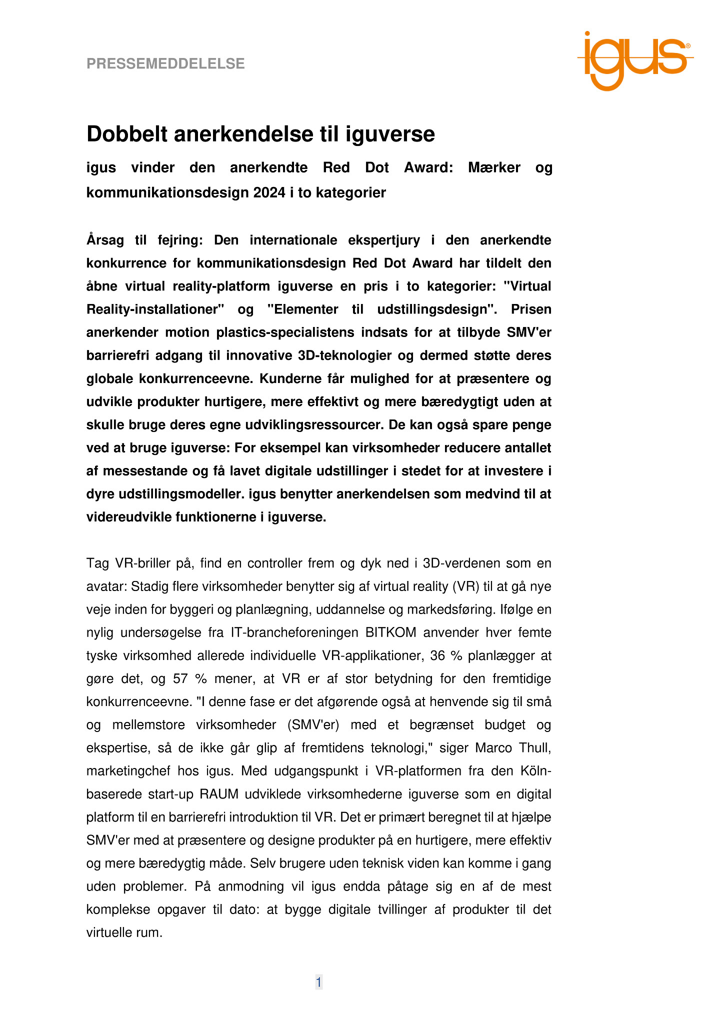 Årsag til fejring: Den internationale ekspertjury i den anerkendte konkurrence for kommunikationsdesign Red Dot Award har tildelt den åbne virtual reality-platform iguverse en pris i to kategorier: “Virtual Reality-installationer” og “Elementer til udstillingsdesign”. Prisen anerkender motion plastics-specialistens indsats for at tilbyde SMV’er barrierefri adgang til innovative 3D-teknologier og dermed støtte deres globale konkurrenceevne. Kunderne får mulighed for at præsentere og udvikle produkter hurtigere, mere effektivt og mere bæredygtigt uden at skulle bruge deres egne udviklingsressourcer. De kan også spare penge ved at bruge iguverse: For eksempel kan virksomheder reducere antallet af messestande og få lavet digitale udstillinger i stedet for at investere i dyre udstillingsmodeller. igus benytter anerkendelsen som medvind til at videreudvikle funktionerne i iguverse.