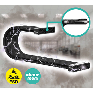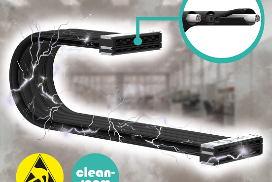 igus har tilføjet en ESD-variant specielt til meget følsomme renrum til sin flade e-skin-serie. Det modulære båndkabels nye materiale forhindrer kæden i at blive elektrostatisk opladet og sikrer, at den ikke genererer partikler, selv under meget hurtige bevægelser. Det modulære design med individuelle pods gør det også muligt hurtigt at fylde energiforsyningssystemet.
