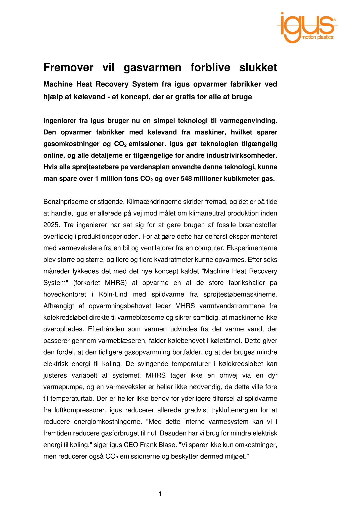 Ingeniører fra igus bruger nu en simpel teknologi til varmegenvinding. Den opvarmer fabrikker med kølevand fra maskiner, hvilket sparer gasomkostninger og CO2 emissioner. igus gør teknologien tilgængelig online, og alle detaljerne er tilgængelige for andre industrivirksomheder. Hvis alle sprøjtestøbere på verdensplan anvendte denne teknologi, kunne man spare over 1 million tons CO2 og over 548 millioner kubikmeter gas.