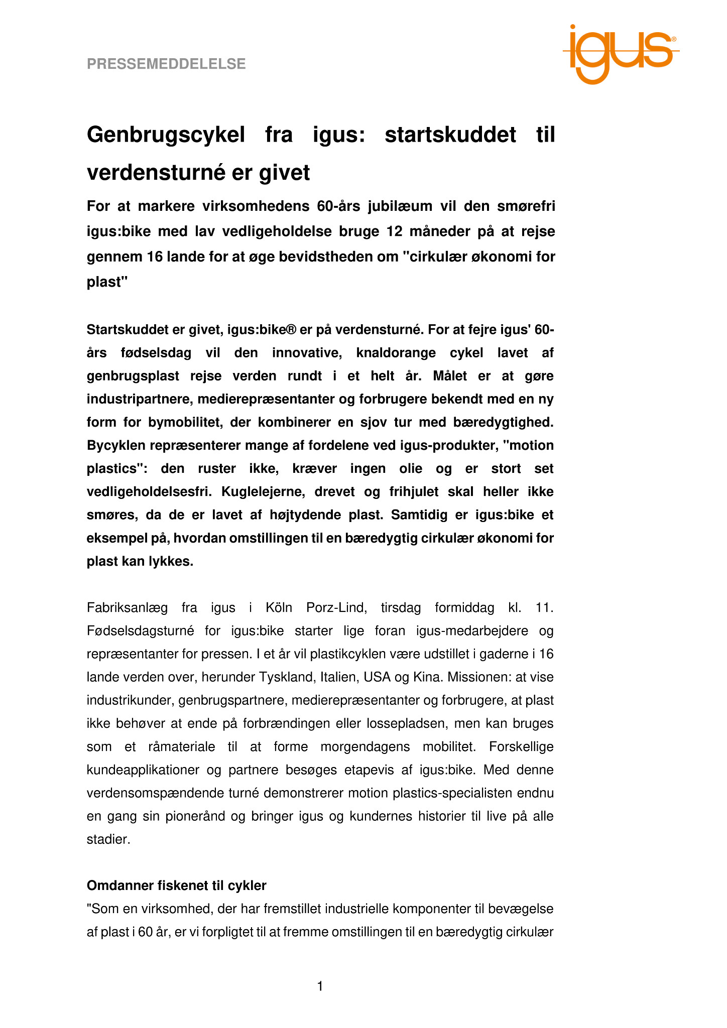 Startskuddet er givet, igus:bike® er på verdensturné. For at fejre igus’ 60-års fødselsdag vil den innovative, knaldorange cykel lavet af genbrugsplast rejse verden rundt i et helt år. Målet er at gøre industripartnere, medierepræsentanter og forbrugere bekendt med en ny form for bymobilitet, der kombinerer en sjov tur med bæredygtighed. Bycyklen repræsenterer mange af fordelene ved igus-produkter, “motion plastics”: den ruster ikke, kræver ingen olie og er stort set vedligeholdelsesfri. Kuglelejerne, drevet og frihjulet skal heller ikke smøres, da de er lavet af højtydende plast. Samtidig er igus:bike et eksempel på, hvordan omstillingen til en bæredygtig cirkulær økonomi for plast kan lykkes.