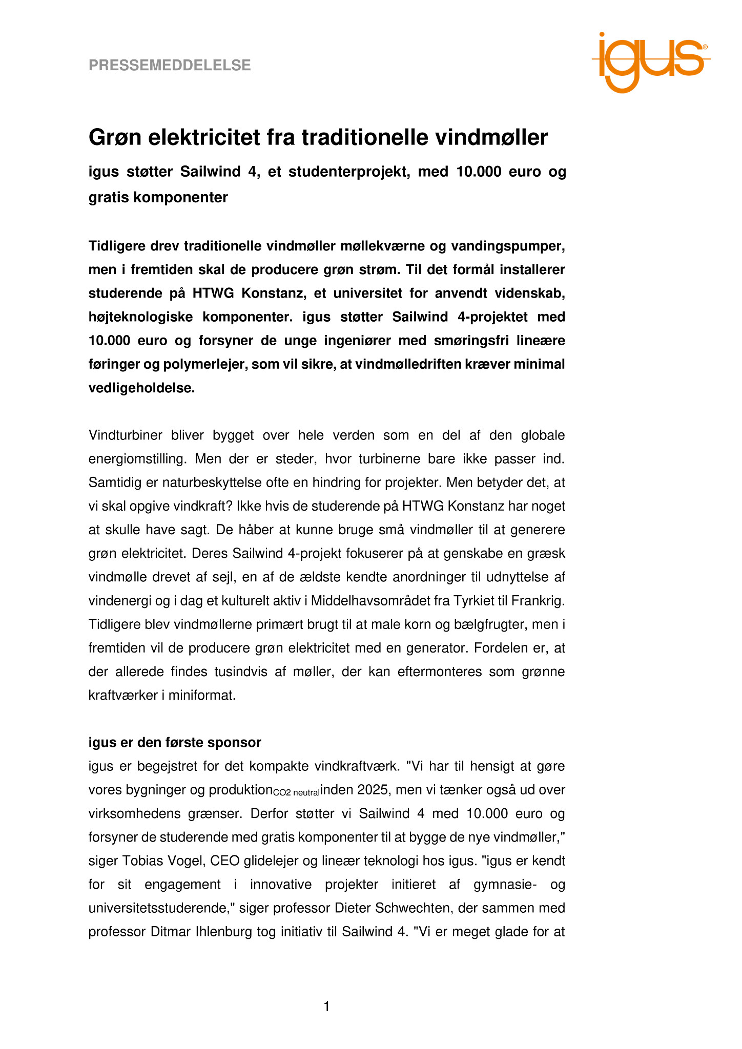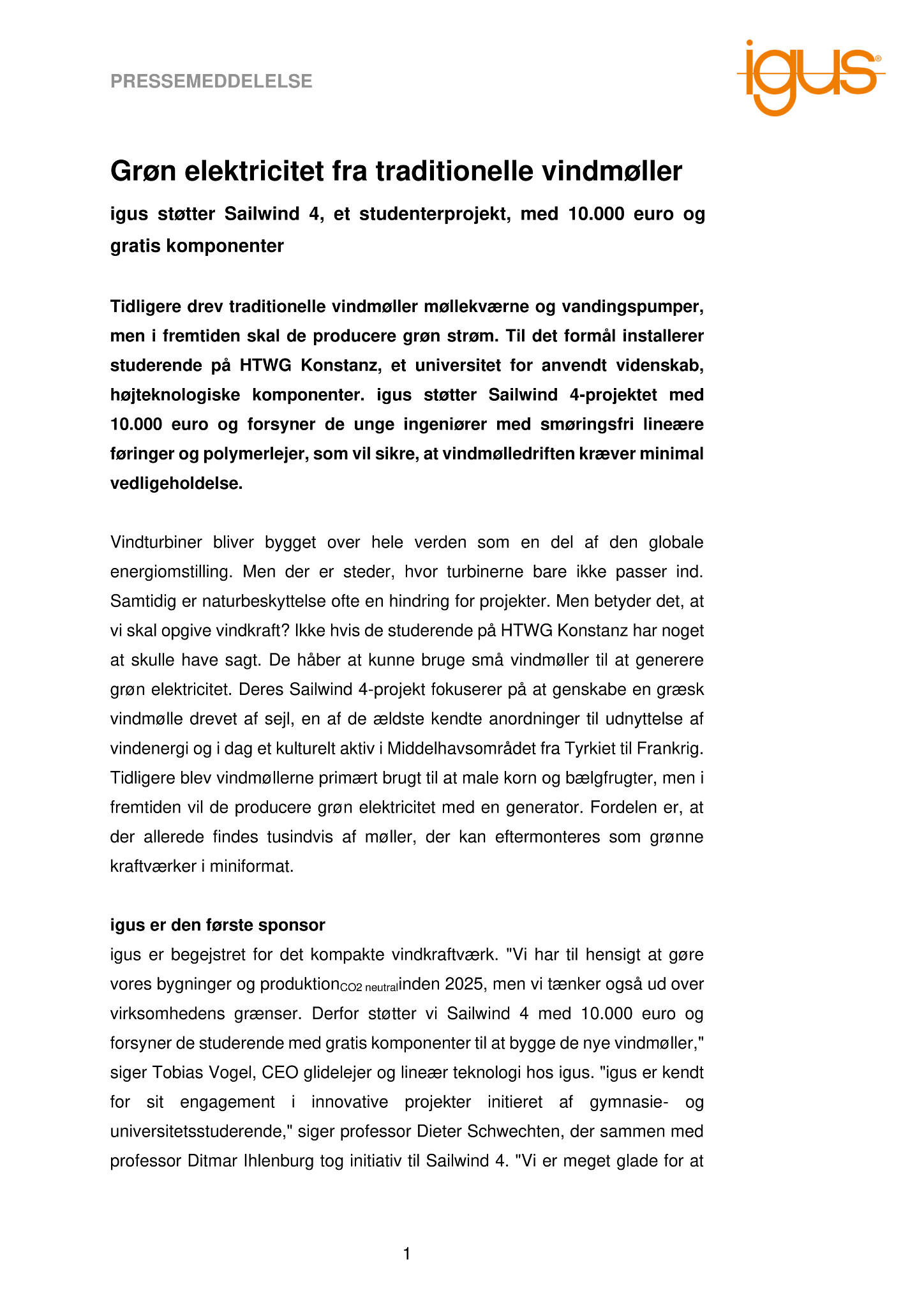 igus er begejstret for det kompakte vindkraftværk. “Vi har til hensigt at gøre vores bygninger og produktionCO2 neutralinden 2025, men vi tænker også ud over virksomhedens grænser. Derfor støtter vi Sailwind 4 med 10.000 euro og forsyner de studerende med gratis komponenter til at bygge de nye vindmøller,” siger Tobias Vogel, CEO glidelejer og lineær teknologi hos igus. “igus er kendt for sit engagement i innovative projekter initieret af gymnasie- og universitetsstuderende,” siger professor Dieter Schwechten, der sammen med professor Ditmar Ihlenburg tog initiativ til Sailwind 4. “Vi er meget glade for at have igus som vores første partner og håber at få flere projektstøtter fra industrien.”