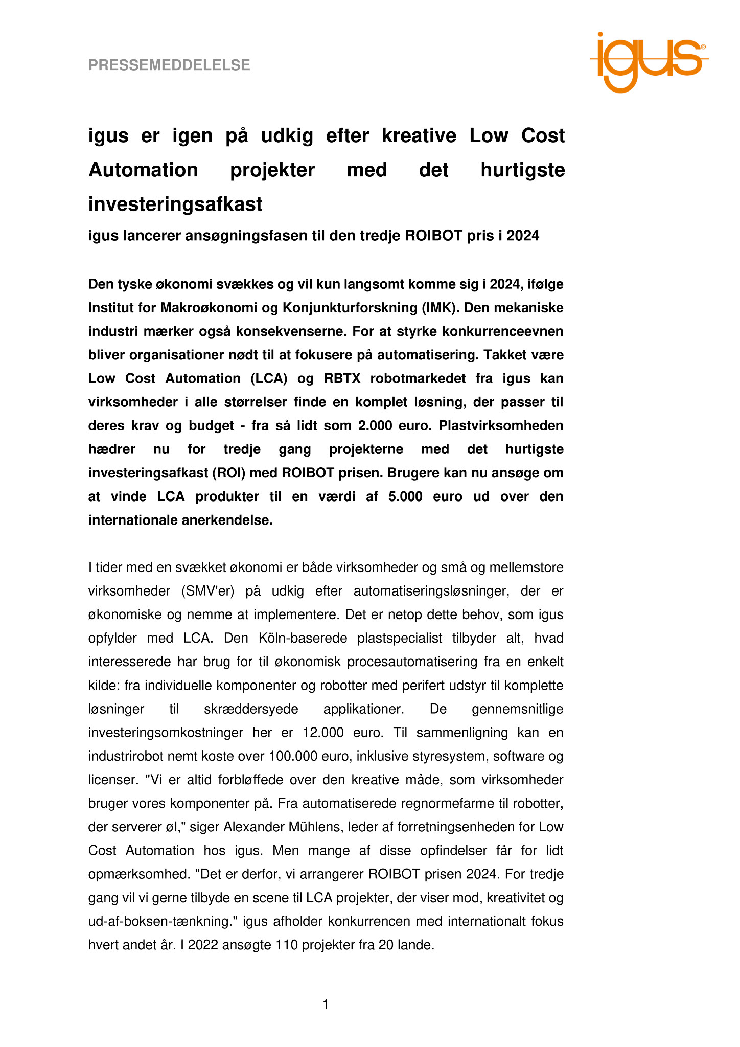 Den tyske økonomi svækkes og vil kun langsomt komme sig i 2024, ifølge Institut for Makroøkonomi og Konjunkturforskning (IMK). Den mekaniske industri mærker også konsekvenserne. For at styrke konkurrenceevnen bliver organisationer nødt til at fokusere på automatisering. Takket være Low Cost Automation (LCA) og RBTX robotmarkedet fra igus kan virksomheder i alle størrelser finde en komplet løsning, der passer til deres krav og budget – fra så lidt som 2.000 euro. Plastvirksomheden hædrer nu for tredje gang projekterne med det hurtigste investeringsafkast (ROI) med ROIBOT prisen. Brugere kan nu ansøge om at vinde LCA produkter til en værdi af 5.000 euro ud over den internationale anerkendelse.