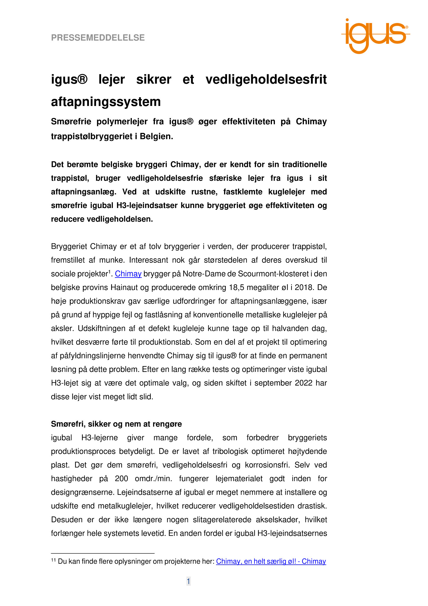 Bryggeriet Chimay er et af tolv bryggerier i verden, der producerer trappistøl, fremstillet af munke. Interessant nok går størstedelen af deres overskud til sociale projekter . Chimay brygger på Notre-Dame de Scourmont-klosteret i den belgiske provins Hainaut og producerede omkring 18,5 megaliter øl i 2018. De høje produktionskrav gav særlige udfordringer for aftapningsanlæggene, især på grund af hyppige fejl og fastlåsning af konventionelle metalliske kuglelejer på aksler. Udskiftningen af et defekt kugleleje kunne tage op til halvanden dag, hvilket desværre førte til produktionstab. Som en del af et projekt til optimering af påfyldningslinjerne henvendte Chimay sig til igus® for at finde en permanent løsning på dette problem. Efter en lang række tests og optimeringer viste igubal H3-lejet sig at være det optimale valg, og siden skiftet i september 2022 har disse lejer vist meget lidt slid.