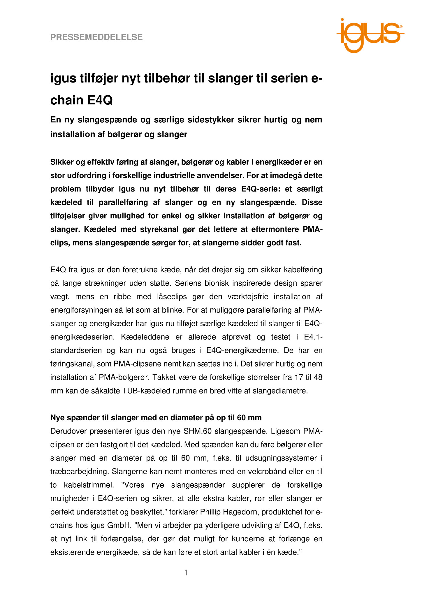 Derudover præsenterer igus den nye SHM.60 slangespænde. Ligesom PMA-clipsen er den fastgjort til det kædeled. Med spænden kan du føre bølgerør eller slanger med en diameter på op til 60 mm, f.eks. til udsugningssystemer i træbearbejdning. Slangerne kan nemt monteres med en velcrobånd eller en til to kabelstrimmel. “Vores nye slangespænder supplerer de forskellige muligheder i E4Q-serien og sikrer, at alle ekstra kabler, rør eller slanger er perfekt understøttet og beskyttet,” forklarer Phillip Hagedorn, produktchef for e-chains hos igus GmbH. “Men vi arbejder på yderligere udvikling af E4Q, f.eks. et nyt link til forlængelse, der gør det muligt for kunderne at forlænge en eksisterende energikæde, så de kan føre et stort antal kabler i én kæde.”