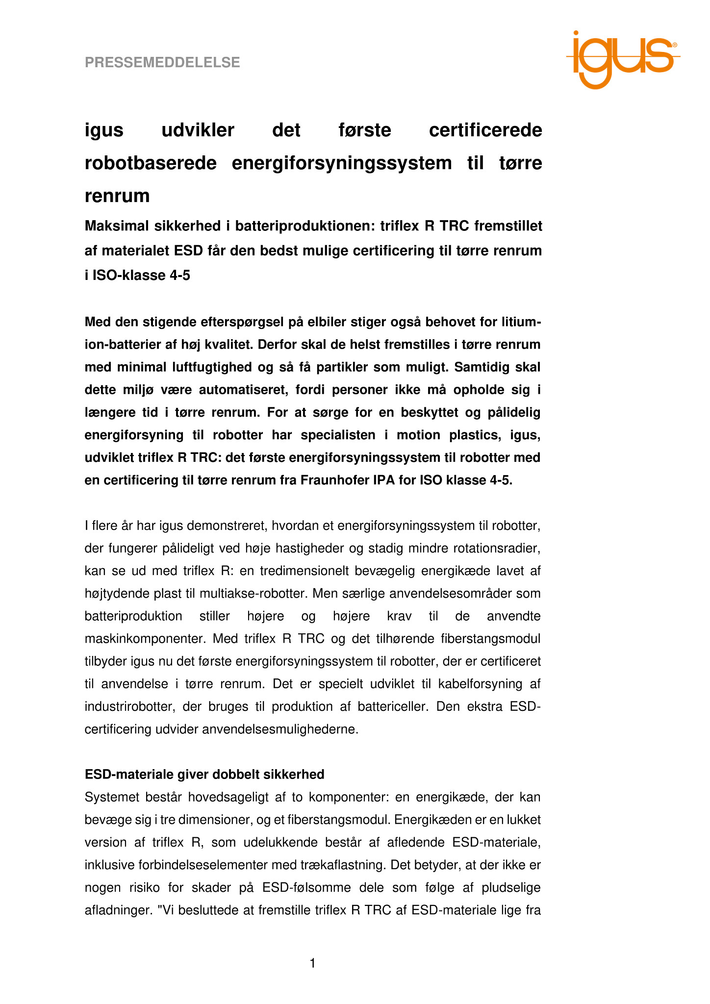 Med den stigende efterspørgsel på elbiler stiger også behovet for litium-ion-batterier af høj kvalitet. Derfor skal de helst fremstilles i tørre renrum med minimal luftfugtighed og så få partikler som muligt. Samtidig skal dette miljø være automatiseret, fordi personer ikke må opholde sig i længere tid i tørre renrum. For at sørge for en beskyttet og pålidelig energiforsyning til robotter har specialisten i motion plastics, igus, udviklet triflex R TRC: det første energiforsyningssystem til robotter med en certificering til tørre renrum fra Fraunhofer IPA for ISO klasse 4-5.