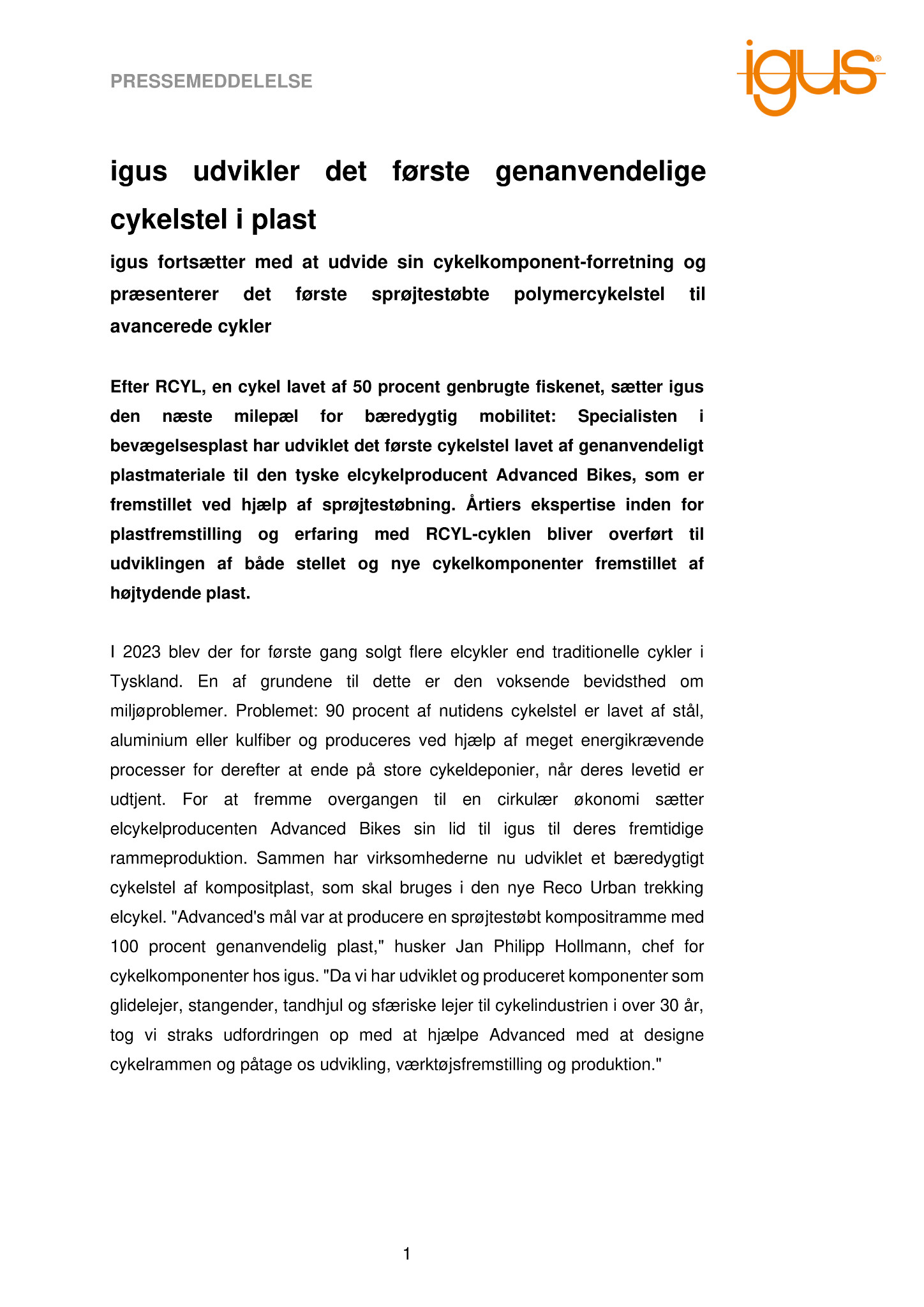 Efter RCYL, en cykel lavet af 50 procent genbrugte fiskenet, sætter igus den næste milepæl for bæredygtig mobilitet: Specialisten i bevægelsesplast har udviklet det første cykelstel lavet af genanvendeligt plastmateriale til den tyske elcykelproducent Advanced Bikes, som er fremstillet ved hjælp af sprøjtestøbning. Årtiers ekspertise inden for plastfremstilling og erfaring med RCYL-cyklen bliver overført til udviklingen af både stellet og nye cykelkomponenter fremstillet af højtydende plast.