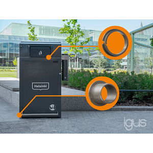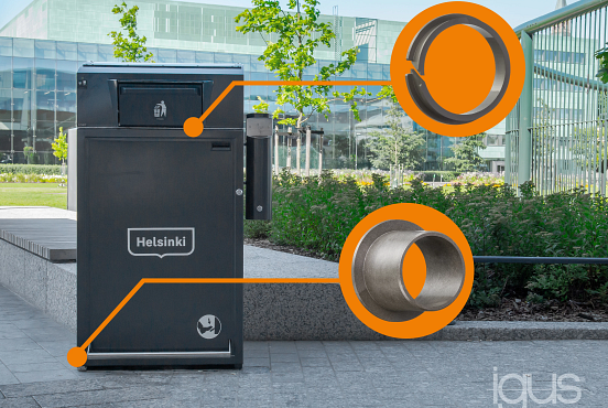 Pizzabakker, kaffekrus og drikkevaredåser. I årevis har byer over hele Europa kæmpet mod denne strøm af affald. Konventionelle affaldsbeholdere når i stigende grad deres grænser. Den finske virksomheds svar er CitySolar affaldsbeholderen, som komprimerer affaldet, hvilket øger beholderens kapacitet til det seksdobbelte. Affaldsspanden er tilsluttet til internettet og anmoder om tømning, før den når sin maksimale kapacitet. For at øge bæredygtigheden for den nye affaldsbeholdertype anvender ingeniørerne komponenter, der ikke kræver vedligeholdelse. Derfor anvendes smørings- og vedligeholdelsesfrie igus iglidur G- og iglidur M250 plastglidelejer til mekanikken i pressen og fodpedalen. Konventionelle metallejer var udelukket, fordi høj luftfugtighed og smøring er et problem den i daglige drift. iglidur glidelejer er derimod ikke følsomme over for fugt, støv eller snavs. En test i igus’ 3.800 kvadratmeter store interne laboratorium viser, hvor slidstærke lejerne er. I testen blev glidelejerne drejet på en gasnitrificeret St52 stålaksel med en belastning på 30 MPa ved en hastighed på 0,01 meter i sekundet. iglidur G glidelejerne udviste stort set ingen tegn på slitage selv efter 200.000 cyklusser. Det gør dem ideelle til pålidelig, vedligeholdelsesfri brug i al slags vejr i mange år.