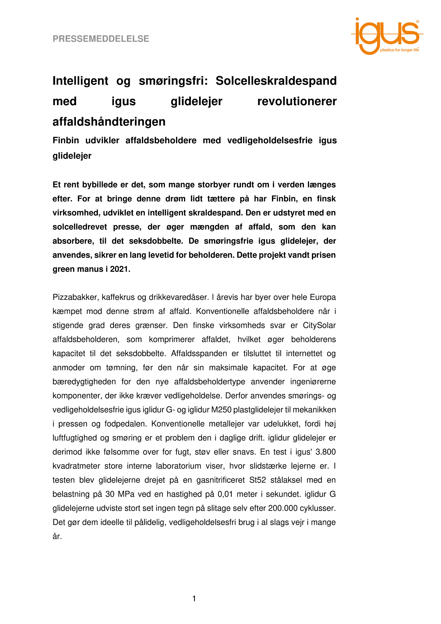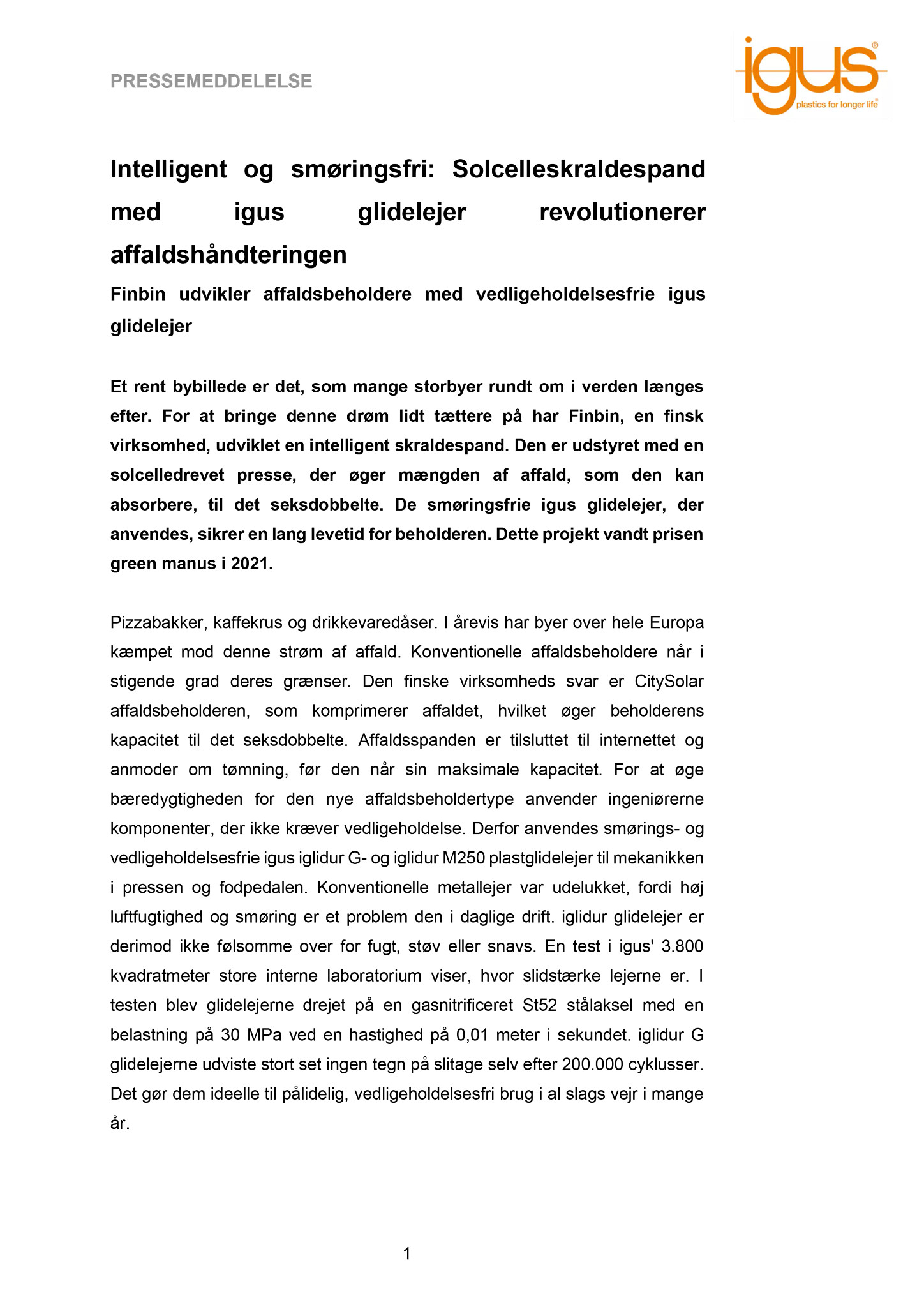 Et rent bybillede er det, som mange storbyer rundt om i verden længes efter. For at bringe denne drøm lidt tættere på har Finbin, en finsk virksomhed, udviklet en intelligent skraldespand. Den er udstyret med en solcelledrevet presse, der øger mængden af affald, som den kan absorbere, til det seksdobbelte. De smøringsfrie igus glidelejer, der anvendes, sikrer en lang levetid for beholderen. Dette projekt vandt prisen green manus i 2021.