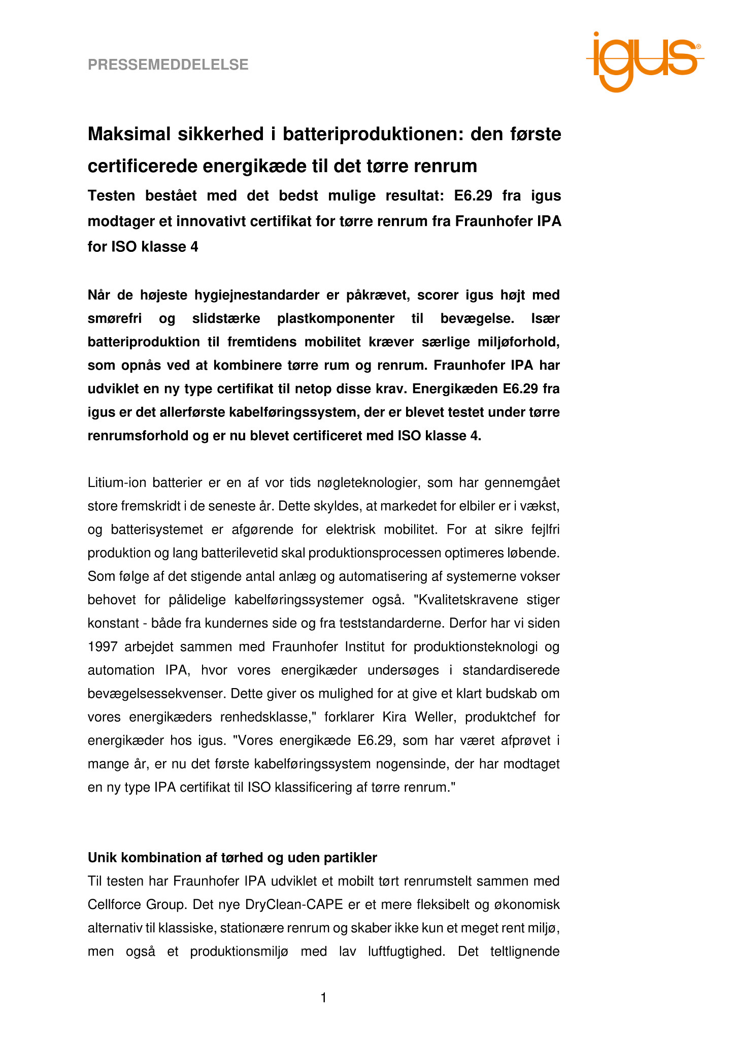Litium-ion batterier er en af vor tids nøgleteknologier, som har gennemgået store fremskridt i de seneste år. Dette skyldes, at markedet for elbiler er i vækst, og batterisystemet er afgørende for elektrisk mobilitet. For at sikre fejlfri produktion og lang batterilevetid skal produktionsprocessen optimeres løbende. Som følge af det stigende antal anlæg og automatisering af systemerne vokser behovet for pålidelige kabelføringssystemer også. “Kvalitetskravene stiger konstant – både fra kundernes side og fra teststandarderne. Derfor har vi siden 1997 arbejdet sammen med Fraunhofer Institut for produktionsteknologi og automation IPA, hvor vores energikæder undersøges i standardiserede bevægelsessekvenser. Dette giver os mulighed for at give et klart budskab om vores energikæders renhedsklasse,” forklarer Kira Weller, produktchef for energikæder hos igus. “Vores energikæde E6.29, som har været afprøvet i mange år, er nu det første kabelføringssystem nogensinde, der har modtaget en ny type IPA certifikat til ISO klassificering af tørre renrum.”