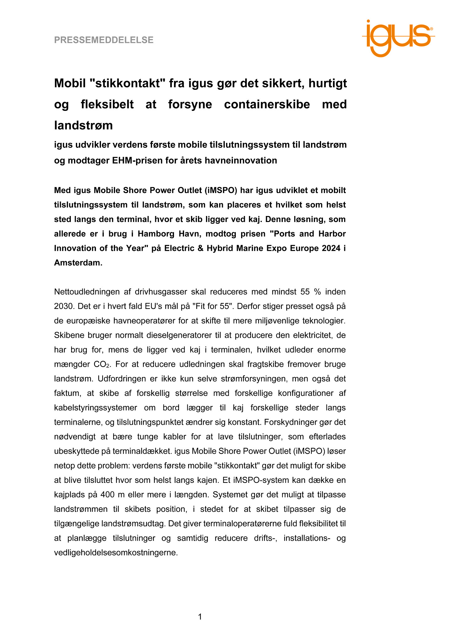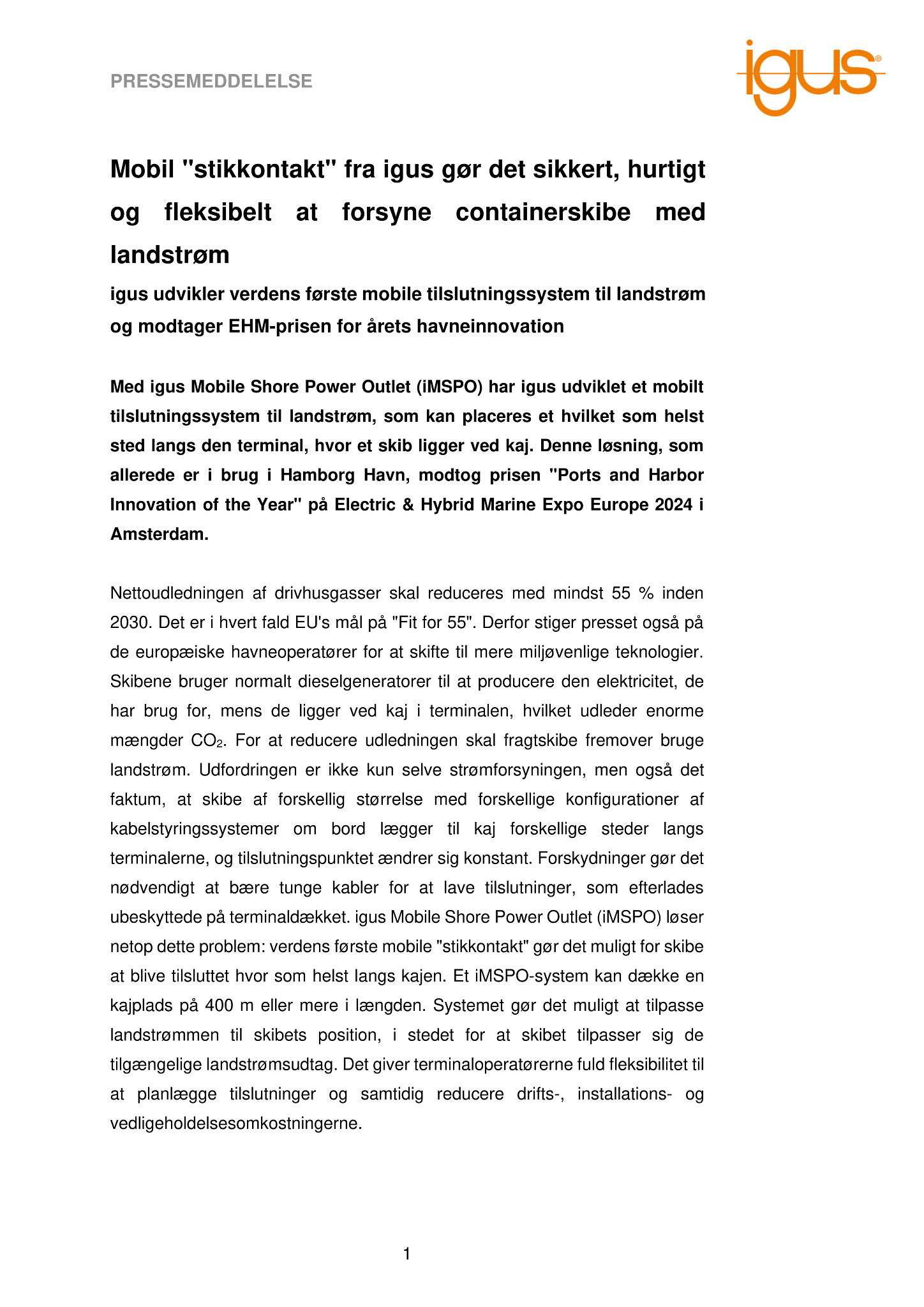 Med igus Mobile Shore Power Outlet (iMSPO) har igus udviklet et mobilt tilslutningssystem til landstrøm, som kan placeres et hvilket som helst sted langs den terminal, hvor et skib ligger ved kaj. Denne løsning, som allerede er i brug i Hamborg Havn, modtog prisen “Ports and Harbor Innovation of the Year” på Electric & Hybrid Marine Expo Europe 2024 i Amsterdam.