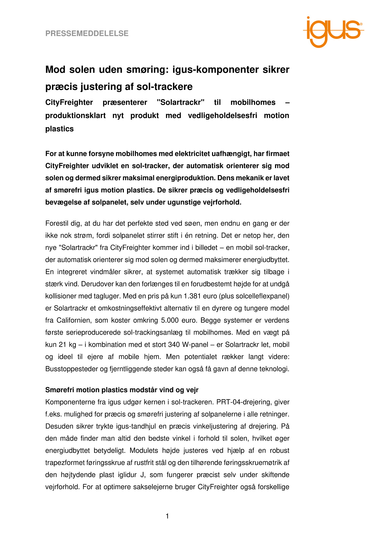 For at kunne forsyne mobilhomes med elektricitet uafhængigt, har firmaet CityFreighter udviklet en sol-tracker, der automatisk orienterer sig mod solen og dermed sikrer maksimal energiproduktion. Dens mekanik er lavet af smørefri igus motion plastics. De sikrer præcis og vedligeholdelsesfri bevægelse af solpanelet, selv under ugunstige vejrforhold.
