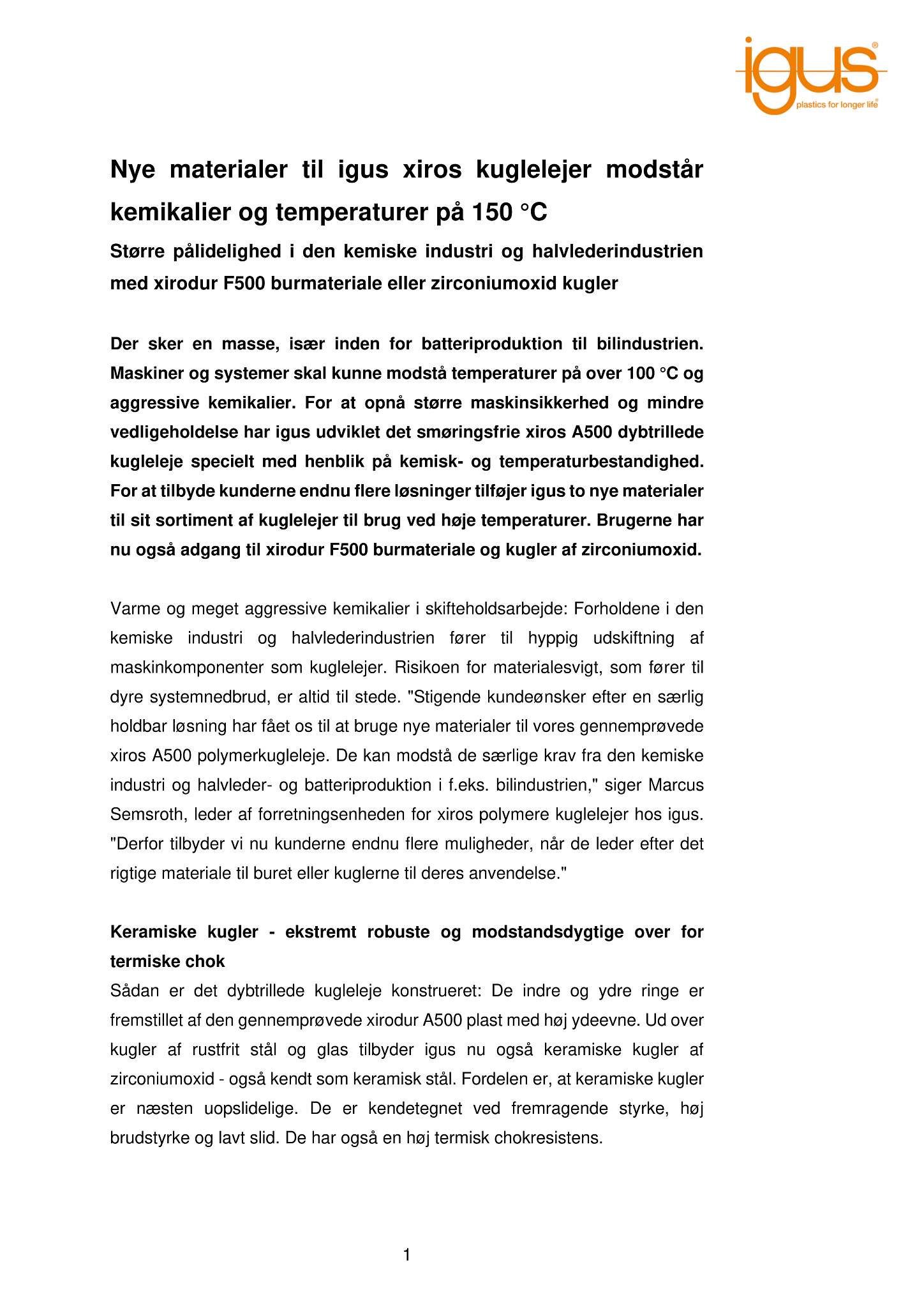 Varme og meget aggressive kemikalier i skifteholdsarbejde: Forholdene i den kemiske industri og halvlederindustrien fører til hyppig udskiftning af maskinkomponenter som kuglelejer. Risikoen for materialesvigt, som fører til dyre systemnedbrud, er altid til stede. “Stigende kundeønsker efter en særlig holdbar løsning har fået os til at bruge nye materialer til vores gennemprøvede xiros A500 polymerkugleleje. De kan modstå de særlige krav fra den kemiske industri og halvleder- og batteriproduktion i f.eks. bilindustrien,” siger Marcus Semsroth, leder af forretningsenheden for xiros polymere kuglelejer hos igus. “Derfor tilbyder vi nu kunderne endnu flere muligheder, når de leder efter det rigtige materiale til buret eller kuglerne til deres anvendelse.”