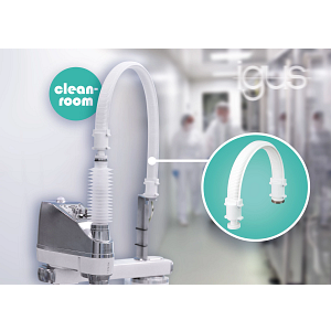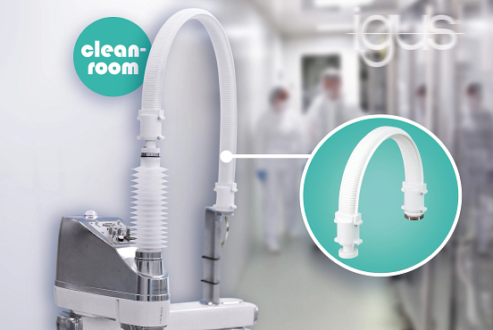 igus lancerer et nyt energiforsyningssystem til SCARA robotter i renrum: Clean SCARA Cable Solution er fremstillet af tribologisk optimeret højtydende plast og fungerer næsten partikelfrit i henhold til ISO klasse 2, selv i højhastighedsapplikationer. Den er også stærkere og mere brugervenlig end klassiske bølgeslanger.