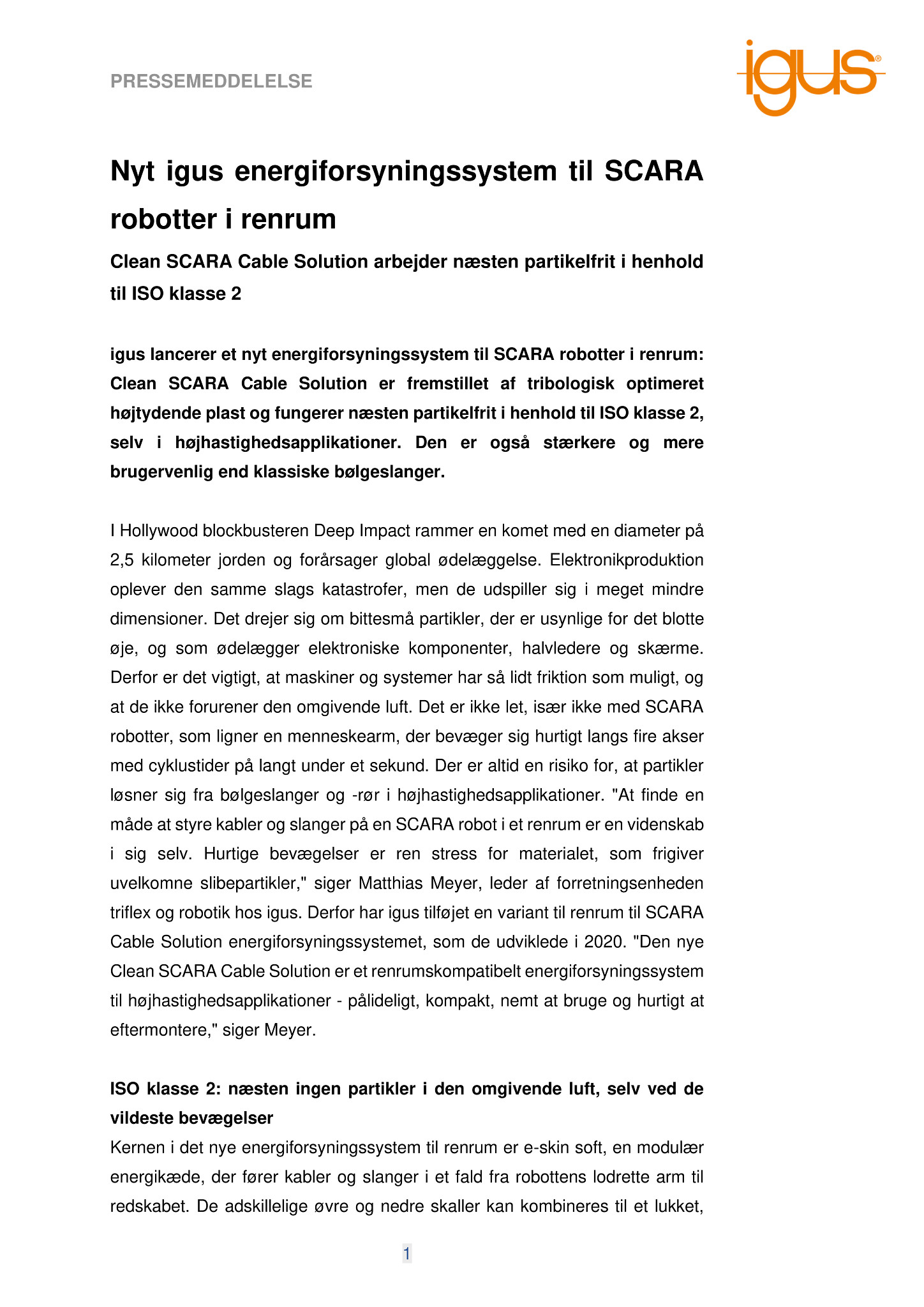 I Hollywood blockbusteren Deep Impact rammer en komet med en diameter på 2,5 kilometer jorden og forårsager global ødelæggelse. Elektronikproduktion oplever den samme slags katastrofer, men de udspiller sig i meget mindre dimensioner. Det drejer sig om bittesmå partikler, der er usynlige for det blotte øje, og som ødelægger elektroniske komponenter, halvledere og skærme. Derfor er det vigtigt, at maskiner og systemer har så lidt friktion som muligt, og at de ikke forurener den omgivende luft. Det er ikke let, især ikke med SCARA robotter, som ligner en menneskearm, der bevæger sig hurtigt langs fire akser med cyklustider på langt under et sekund. Der er altid en risiko for, at partikler løsner sig fra bølgeslanger og -rør i højhastighedsapplikationer. “At finde en måde at styre kabler og slanger på en SCARA robot i et renrum er en videnskab i sig selv. Hurtige bevægelser er ren stress for materialet, som frigiver uvelkomne slibepartikler,” siger Matthias Meyer, leder af forretningsenheden triflex og robotik hos igus. Derfor har igus tilføjet en variant til renrum til SCARA Cable Solution energiforsyningssystemet, som de udviklede i 2020. “Den nye Clean SCARA Cable Solution er et renrumskompatibelt energiforsyningssystem til højhastighedsapplikationer – pålideligt, kompakt, nemt at bruge og hurtigt at eftermontere,” siger Meyer.