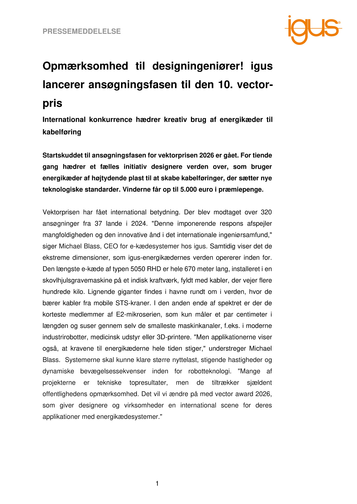 Vektorprisen har fået international betydning. Der blev modtaget over 320 ansøgninger fra 37 lande i 2024. “Denne imponerende respons afspejler mangfoldigheden og den innovative ånd i det internationale ingeniørsamfund,” siger Michael Blass, CEO for e-kædesystemer hos igus. Samtidig viser det de ekstreme dimensioner, som igus-energikædernes verden opererer inden for. Den længste e-kæde af typen 5050 RHD er hele 670 meter lang, installeret i en skovlhjulsgravemaskine på et indisk kraftværk, fyldt med kabler, der vejer flere hundrede kilo. Lignende giganter findes i havne rundt om i verden, hvor de bærer kabler fra mobile STS-kraner. I den anden ende af spektret er der de korteste medlemmer af E2-mikroserien, som kun måler et par centimeter i længden og suser gennem selv de smalleste maskinkanaler, f.eks. i moderne industrirobotter, medicinsk udstyr eller 3D-printere. “Men applikationerne viser også, at kravene til energikæderne hele tiden stiger,” understreger Michael Blass. Systemerne skal kunne klare større nyttelast, stigende hastigheder og dynamiske bevægelsessekvenser inden for robotteknologi. “Mange af projekterne er tekniske topresultater, men de tiltrækker sjældent offentlighedens opmærksomhed. Det vil vi ændre på med vector award 2026, som giver designere og virksomheder en international scene for deres applikationer med energikædesystemer.”