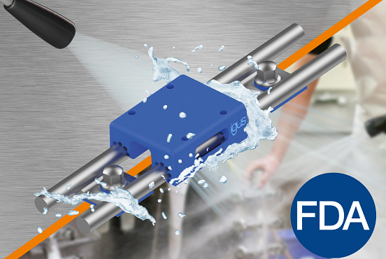 Rengøring med kemikalier er dagligt forekommende for maskiner i fødevareindustrien. Selv den mindste blinde vinkel kan samle fugt og føre til forurening i maskinen. Flere og flere operatører designer derfor dele med vægt på hygiejnisk design. igus er medlem af EHEDG og har udviklet det første lineære føringssystem baseret på retningslinjerne for hygiejnisk design. Ved at bruge FDA-godkendte materialer som den højtydende polymer iglidur A160, højlegeret rustfrit stål og en vaskbar indvendig del af slæden sikres det hygiejniske design.