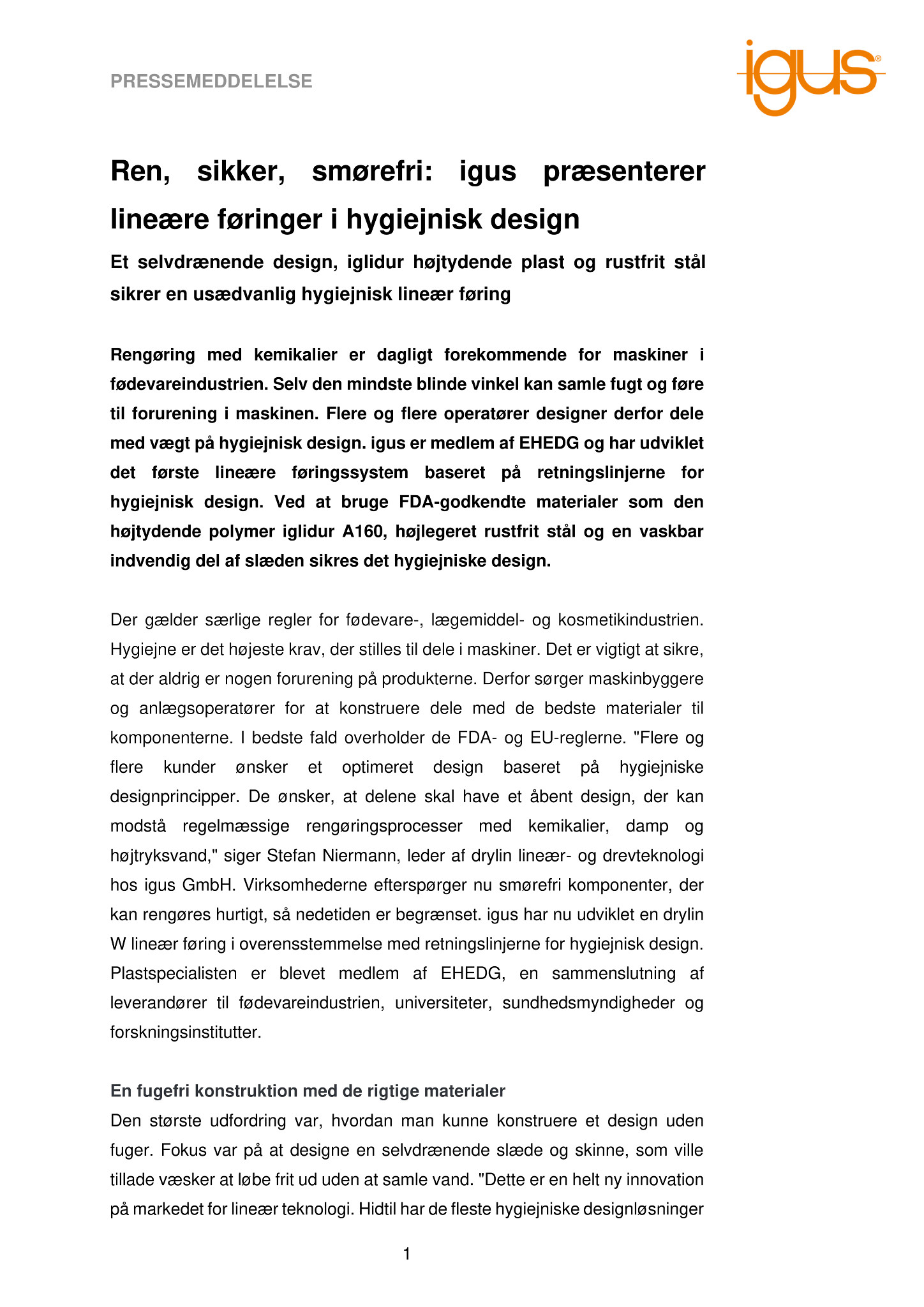 Der gælder særlige regler for fødevare-, lægemiddel- og kosmetikindustrien. Hygiejne er det højeste krav, der stilles til dele i maskiner. Det er vigtigt at sikre, at der aldrig er nogen forurening på produkterne. Derfor sørger maskinbyggere og anlægsoperatører for at konstruere dele med de bedste materialer til komponenterne. I bedste fald overholder de FDA- og EU-reglerne. “Flere og flere kunder ønsker et optimeret design baseret på hygiejniske designprincipper. De ønsker, at delene skal have et åbent design, der kan modstå regelmæssige rengøringsprocesser med kemikalier, damp og højtryksvand,” siger Stefan Niermann, leder af drylin lineær- og drevteknologi hos igus GmbH. Virksomhederne efterspørger nu smørefri komponenter, der kan rengøres hurtigt, så nedetiden er begrænset. igus har nu udviklet en drylin W lineær føring i overensstemmelse med retningslinjerne for hygiejnisk design. Plastspecialisten er blevet medlem af EHEDG, en sammenslutning af leverandører til fødevareindustrien, universiteter, sundhedsmyndigheder og forskningsinstitutter.