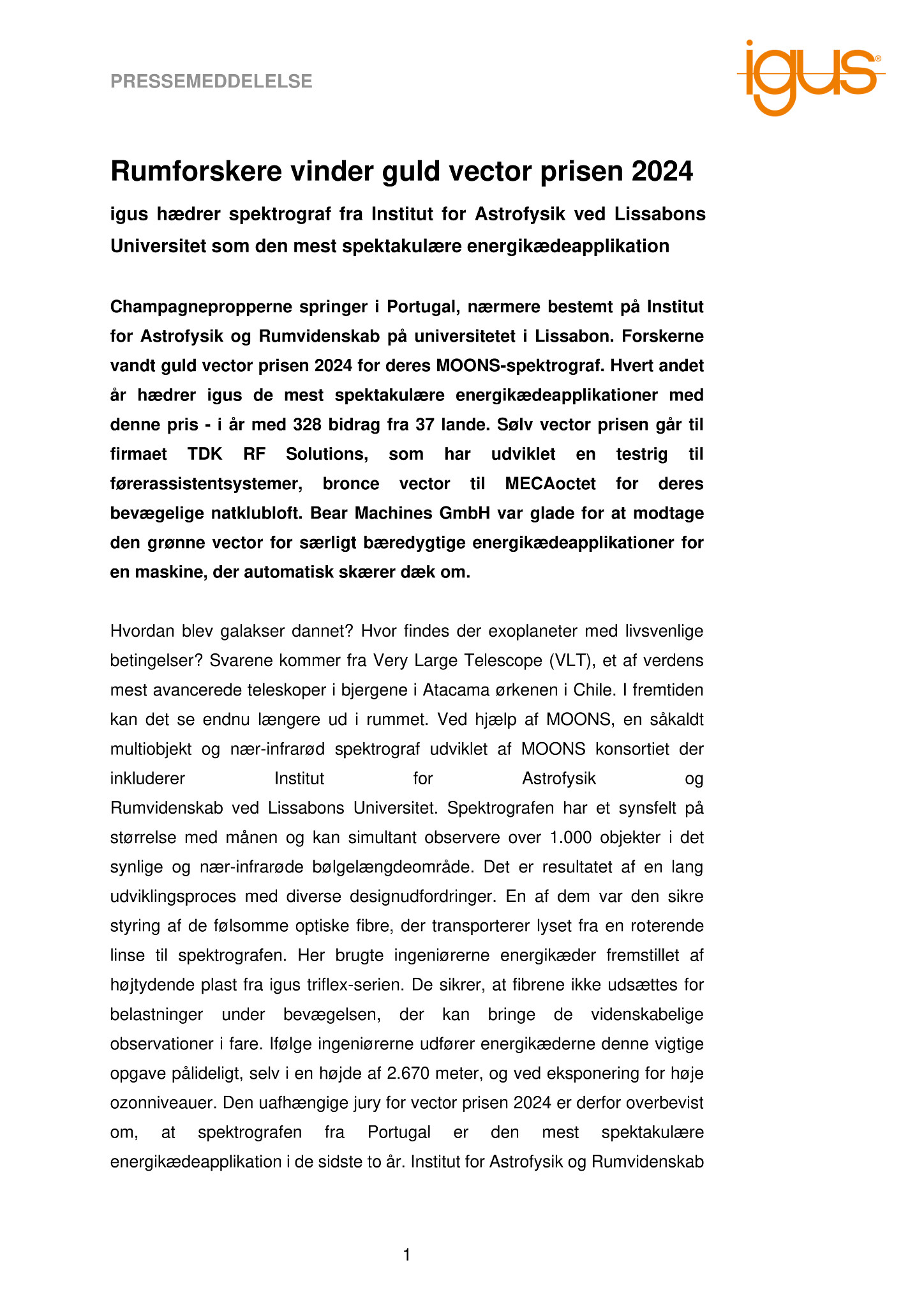 Champagnepropperne springer i Portugal, nærmere bestemt på Institut for Astrofysik og Rumvidenskab på universitetet i Lissabon. Forskerne vandt guld vector prisen 2024 for deres MOONS-spektrograf. Hvert andet år hædrer igus de mest spektakulære energikædeapplikationer med denne pris – i år med 328 bidrag fra 37 lande. Sølv vector prisen går til firmaet TDK RF Solutions, som har udviklet en testrig til førerassistentsystemer, bronce vector til MECAoctet for deres bevægelige natklubloft. Bear Machines GmbH var glade for at modtage den grønne vector for særligt bæredygtige energikædeapplikationer for en maskine, der automatisk skærer dæk om.