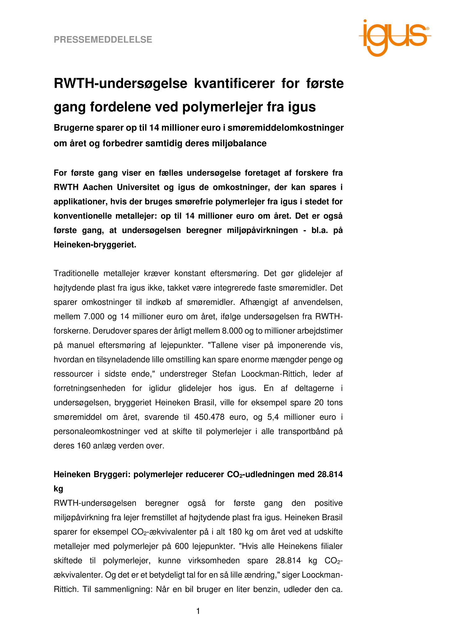 For første gang viser en fælles undersøgelse foretaget af forskere fra RWTH Aachen Universitet og igus de omkostninger, der kan spares i applikationer, hvis der bruges smørefrie polymerlejer fra igus i stedet for konventionelle metallejer: op til 14 millioner euro om året. Det er også første gang, at undersøgelsen beregner miljøpåvirkningen – bl.a. på Heineken-bryggeriet.