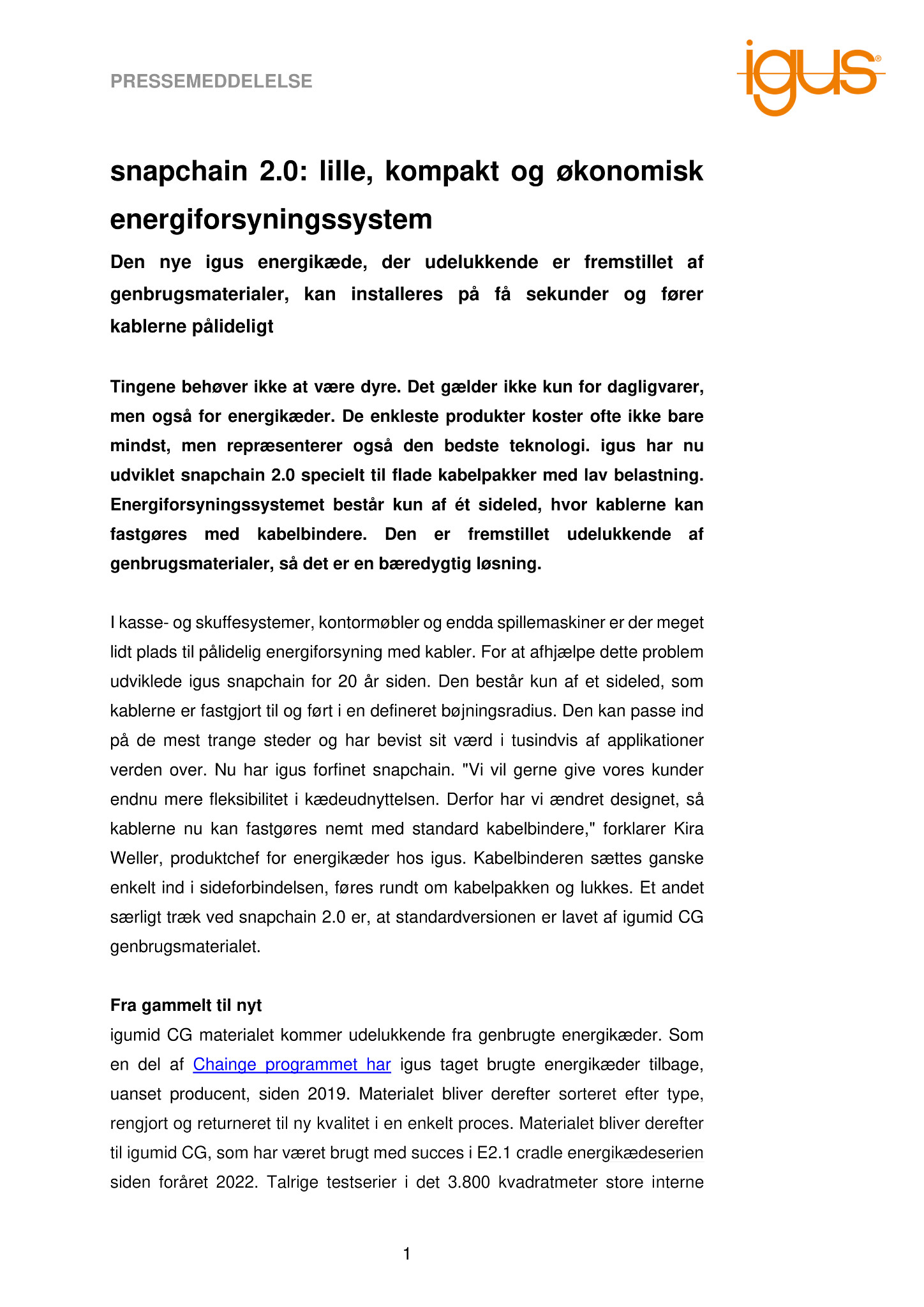 igumid CG materialet kommer udelukkende fra genbrugte energikæder. Som en del af Chainge programmet har igus taget brugte energikæder tilbage, uanset producent, siden 2019. Materialet bliver derefter sorteret efter type, rengjort og returneret til ny kvalitet i en enkelt proces. Materialet bliver derefter til igumid CG, som har været brugt med succes i E2.1 cradle energikædeserien siden foråret 2022. Talrige testserier i det 3.800 kvadratmeter store interne laboratorium på igus’ adresse i Köln har bekræftet dets trækstyrke og brudmoment. Energikæderne af genbrugsmateriale yder et værdifuldt bidrag til ressourcebevarelse og fremmer den cirkulære økonomi. Ifølge miljøvaredeklarationen reducerer denne bæredygtige råstofcyklus også CO2 med 28 %. “snapchain 2.0 er en økonomisk allround-pakke. Den giver vores kunder et produkt, der er pålideligt, bæredygtigt og hurtigt at montere. Det er den anden kædeserie, hvis standardversion vi fremstiller af vores genbrugsmateriale. Ved slutningen af dens levetid kan den også genbruges fuldstændigt,” siger Weller.