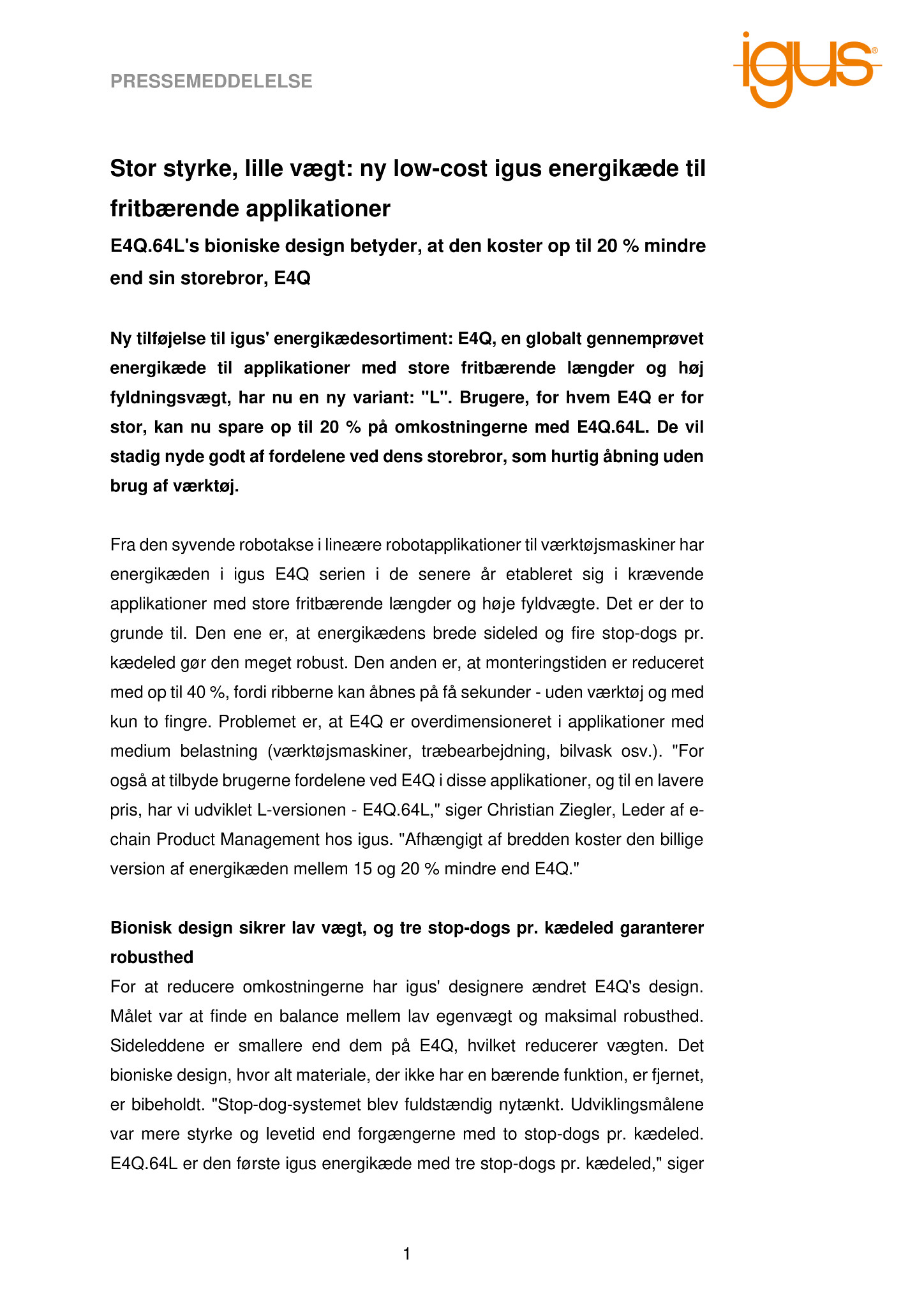 For at reducere omkostningerne har igus’ designere ændret E4Q’s design. Målet var at finde en balance mellem lav egenvægt og maksimal robusthed. Sideleddene er smallere end dem på E4Q, hvilket reducerer vægten. Det bioniske design, hvor alt materiale, der ikke har en bærende funktion, er fjernet, er bibeholdt. “Stop-dog-systemet blev fuldstændig nytænkt. Udviklingsmålene var mere styrke og levetid end forgængerne med to stop-dogs pr. kædeled. E4Q.64L er den første igus energikæde med tre stop-dogs pr. kædeled,” siger Ziegler. “Det sikrer et endnu mere regelmæssigt strømflow og en længere levetid.”