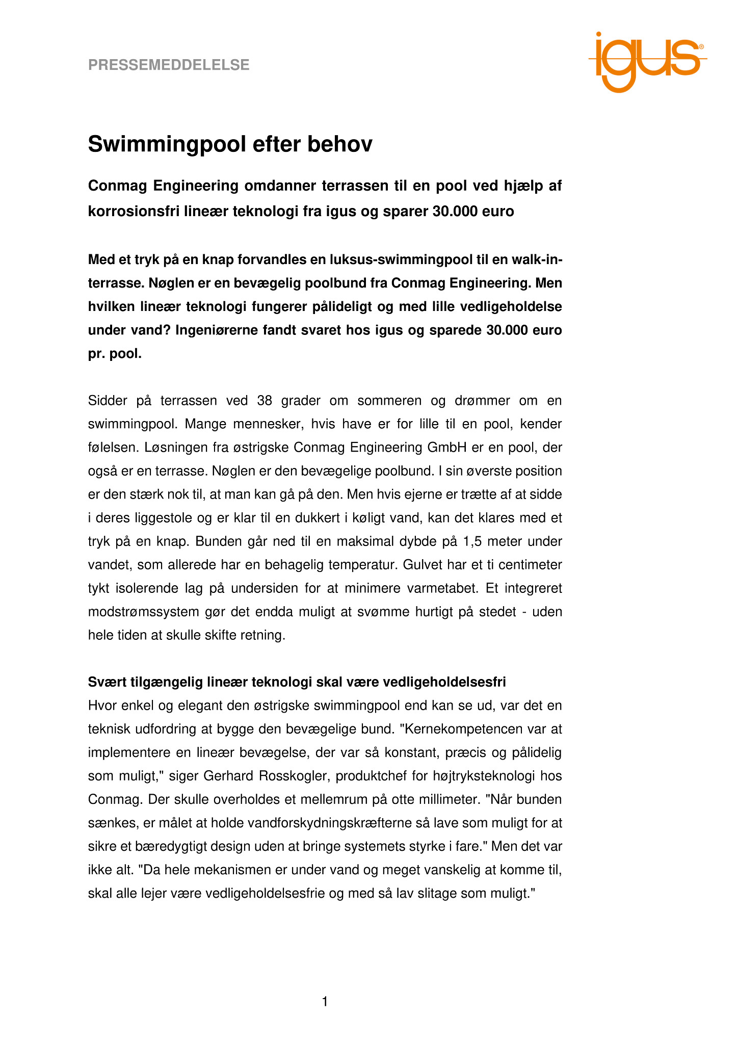 Med et tryk på en knap forvandles en luksus-swimmingpool til en walk-in-terrasse. Nøglen er en bevægelig poolbund fra Conmag Engineering. Men hvilken lineær teknologi fungerer pålideligt og med lille vedligeholdelse under vand? Ingeniørerne fandt svaret hos igus og sparede 30.000 euro pr. pool.
