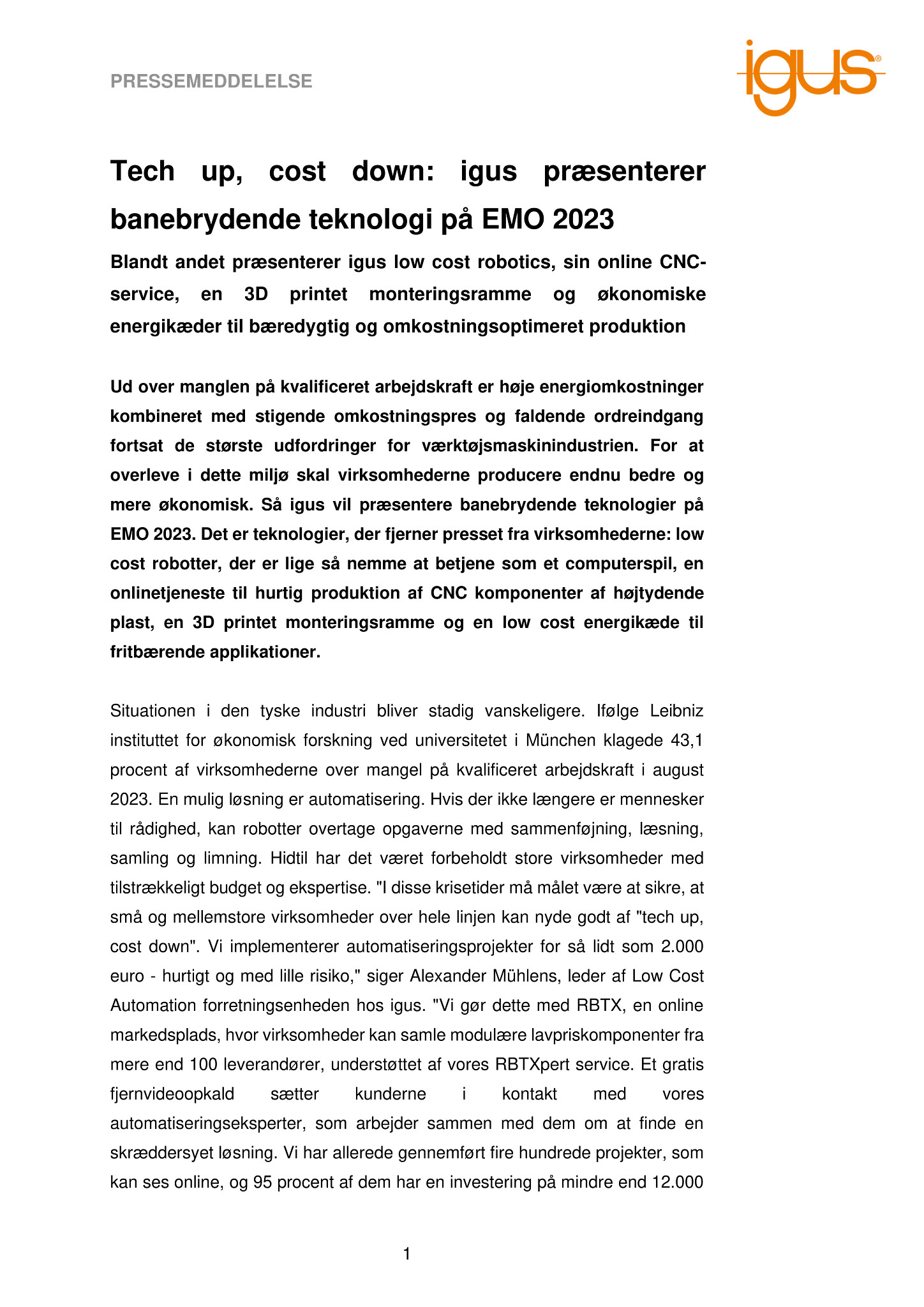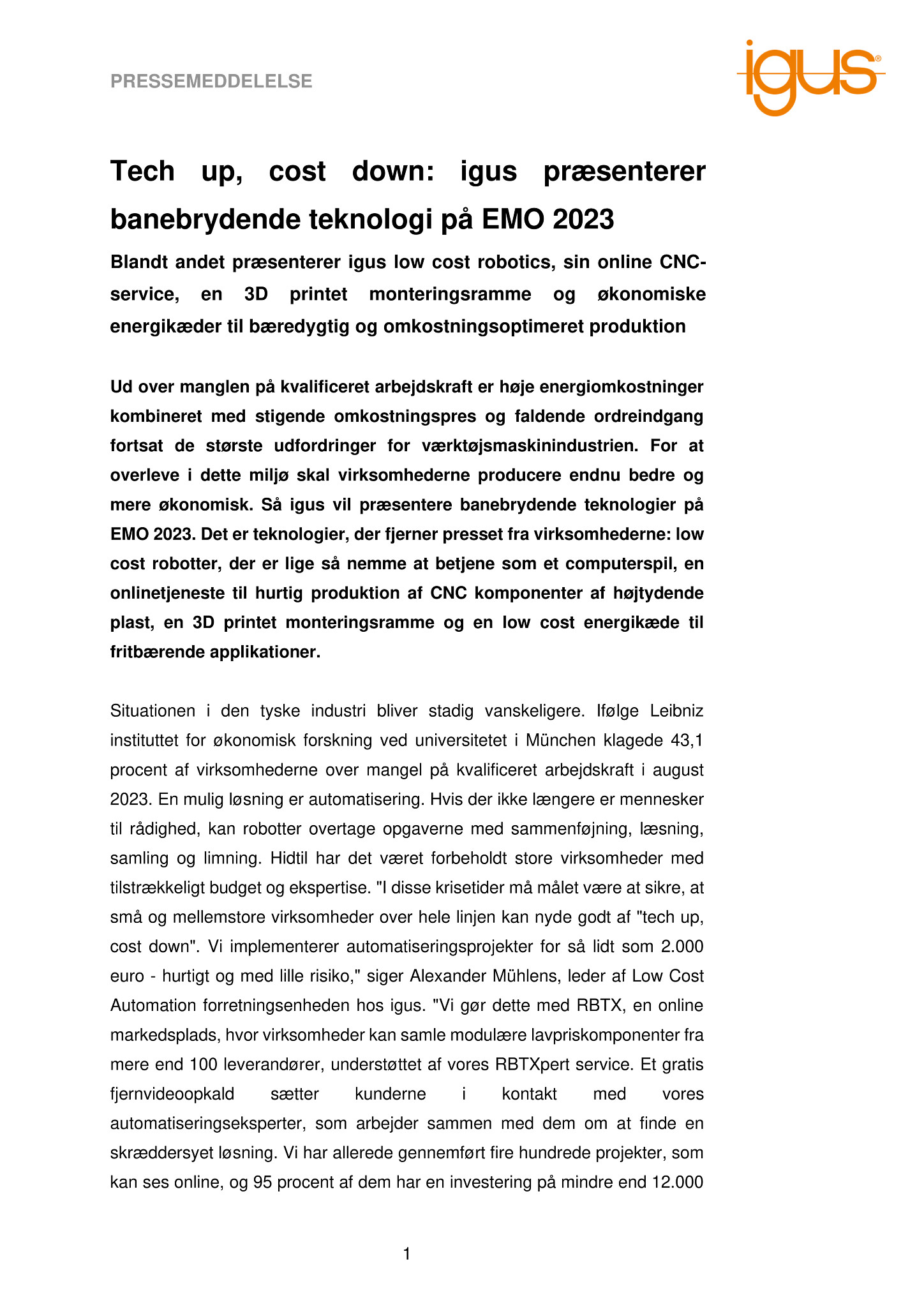 Tech up, cost down: igus præsenterer banebrydende teknologi på EMO 2023