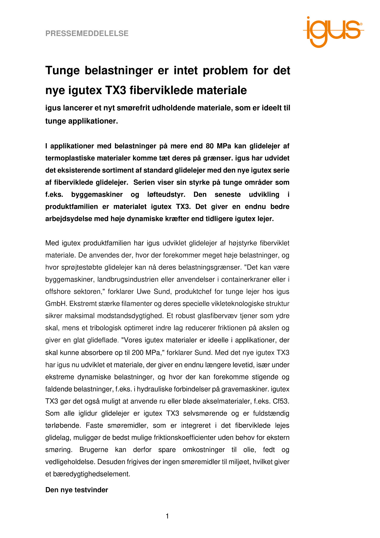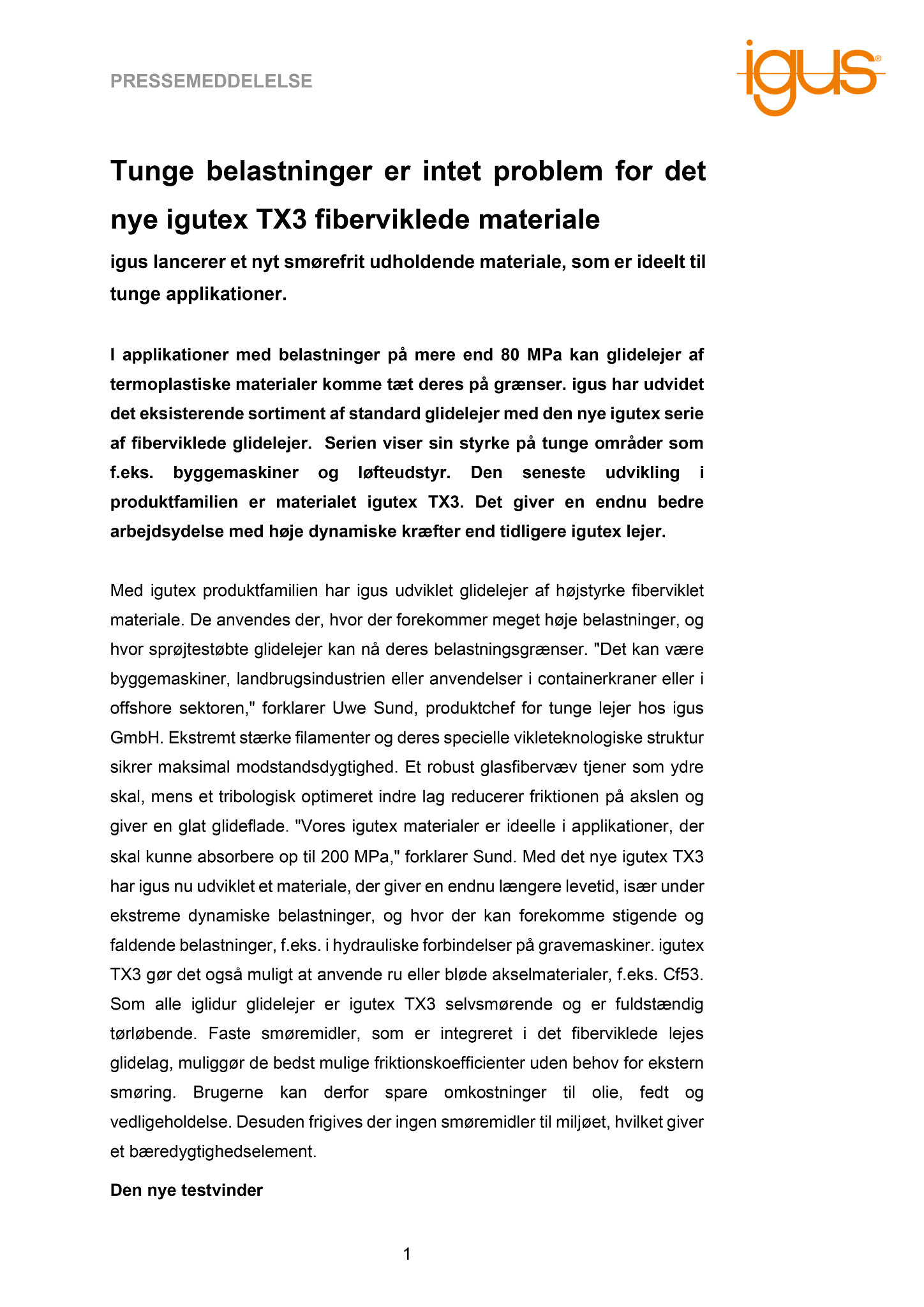 I applikationer med belastninger på mere end 80 MPa kan glidelejer af termoplastiske materialer komme tæt deres på grænser. igus har udvidet det eksisterende sortiment af standard glidelejer med den nye igutex serie af fiberviklede glidelejer. Serien viser sin styrke på tunge områder som f.eks. byggemaskiner og løfteudstyr. Den seneste udvikling i produktfamilien er materialet igutex TX3. Det giver en endnu bedre arbejdsydelse med høje dynamiske kræfter end tidligere igutex lejer.